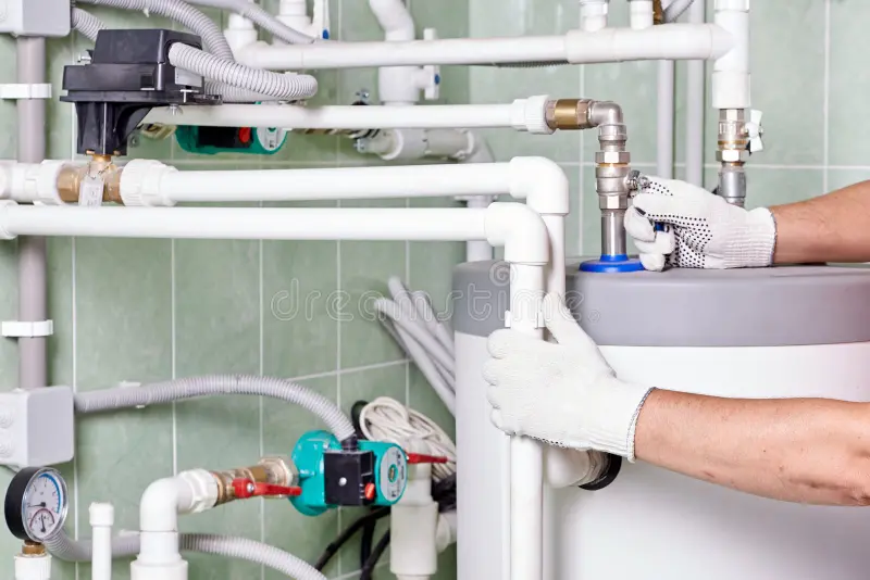 plumber doing maintenance jobs water heating systems engineer controlling pipes boiler room 119782566
